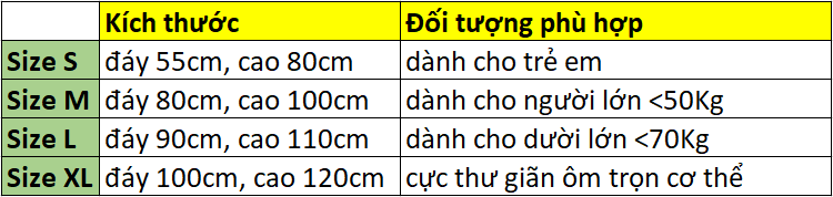 + Size XL: thư giãn ôm trọn cơ thể : đáy 100cm, cao 120cm