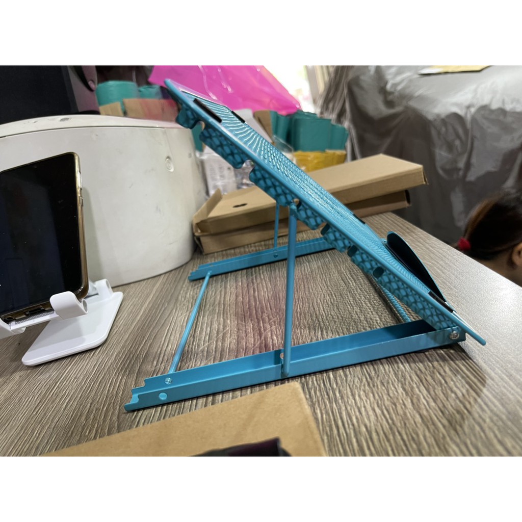 6 góc điều chỉnh khác nhau để thoải mái tối đa khi gõ, đọc và xem, bảo vệ hiệu quả của cột sống cổ. Lưới kim loại thông gió hỗ trợ tản nhiệt giữ cho máy tính xách tay của bạn luôn mát mẻ Đệm silicon chống trầy xước, trơn trượt đảm bảo an toàn cho máy tính của bạn Hợp kim nhôm mạnh mẽ, gọn nhẹ thuận tiện cho bạn để mang nó bất cứ nơi nào Có thể được sử dụng với laptop/ iPad /máy tính bảng /điện thoại... dưới 15inch