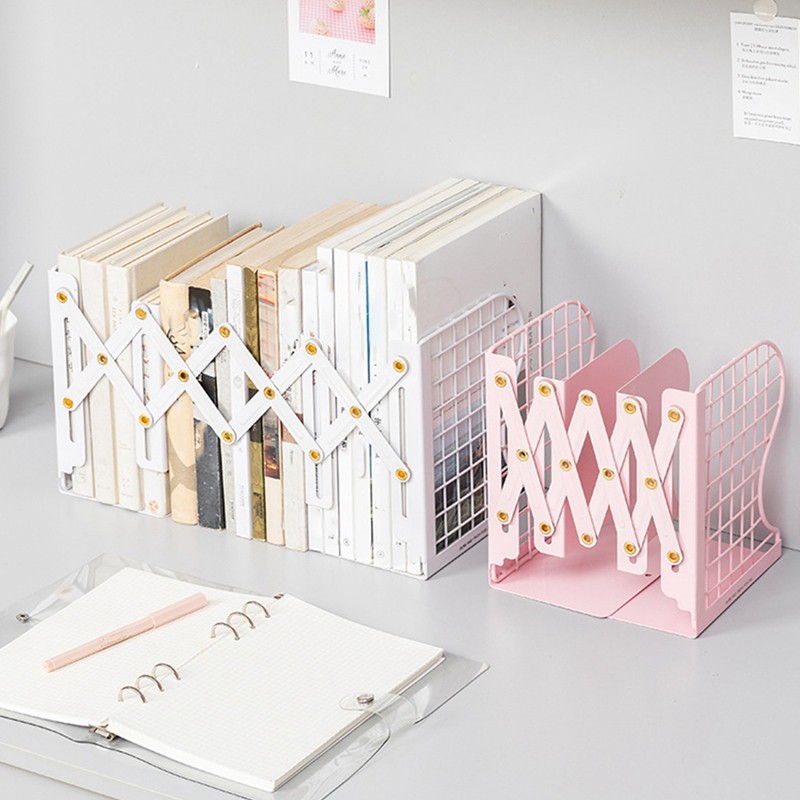 Adjustable Size-- This bookends designed for strength and durability with three vertical compartments.Width 6.1 inch by height 7.8 inch, Retractable length from 4.5 inch to 19.6 inch to meet various requirements. High Quality--Made from sturdy heavy-gauge metal with hard enamel coating. Smooth edges against scratches and chips. Non-Toxic. Heavy duty and large volume are great for holding files, magazine, cookbooks, notebooks, etc. Stable Constructed--Outstanding one-piece chain feature keeps the bookends bookracks more stable. Constructed for max strength and stability. More Use--Use it to hold up books,magazines, dvd,hardbacks, games, comic books, catalogues, text books, binders, cookbooks, reference books, albums, and more! Will be amazing present . Space Save-- This bookends takes less space than traditional bookends. Perfect for storing books away neatly on a desk or shelf. size:Before unfolding: 20 x 11.5 x 15.6cm, after unfolding: 50 x 11.5 x 15.6cm Material:metal colour:Pink / white