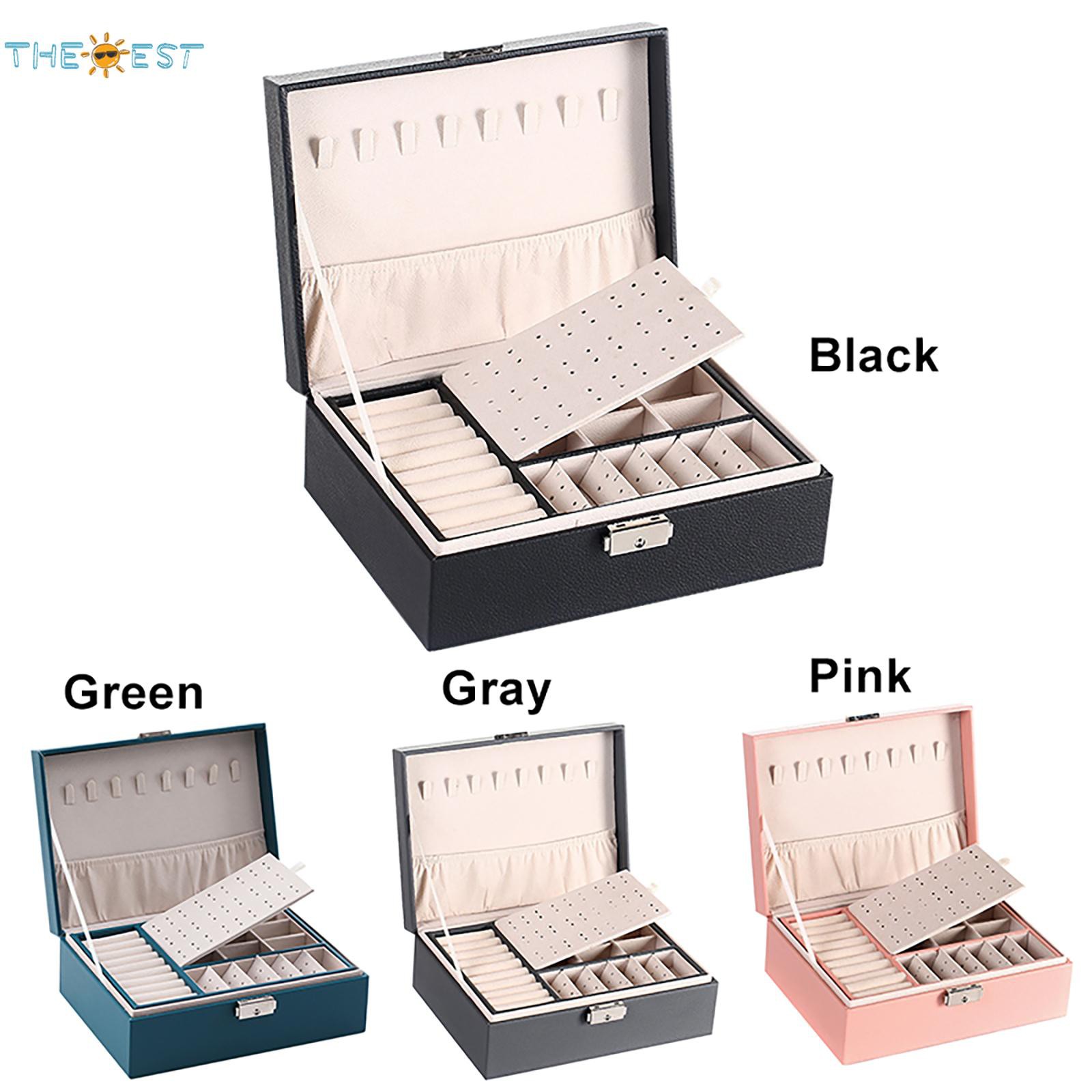 2 Layer Leather Jewelry Box for Women, Large Capacity, Lockable Organizer Holder, Display Storage Case with Lock for Necklace, Earrings, Rings, Ear Studs Feature: - JEWELERY BOXES: Dimensions: 23 x 17 x 9cm (L * W * H) The jewelry box has 2 layers, large capacity, 8 necklace hooks, 74 ear studs slots, 15 earring slots, which is big enough for you to put all your accessories in. With different compartments for you to place earrings, rings and watches, and convenient hooks for hanging necklaces or bracelets to avoid tangles or knots. - Made with premium faux leather and soft fleece lining. durable, waterproof and moisture resistant. It protect your jewelry well from scratches. Classic design add more elegance to this jewelry box, making it a favor of girls and women. - PROTECT YOUR JEWELERY: Designed with a strong and durable metal lock, the jewelry box is easy to open for everyday use. A simple way to protect your jewelry! - FLEXIBLE DESIGN: Simple and compact design jewelry storage box, Not only keeps your dressing table tidy, but it also works as a delicate ornament for your home. Being lightweight and portable, it really is a necessity for women and girls going on travel or business. - PERFECT GIFT: The pretty jewelry storage box will be a perfect gift for family, friends and colleague. Also the best gift for Valentine's Day, Birthday, Mother's Day, Christmas or Wedding. Flexible internal design, you can remove or add the internal support divider plate anytime according to your own needs.