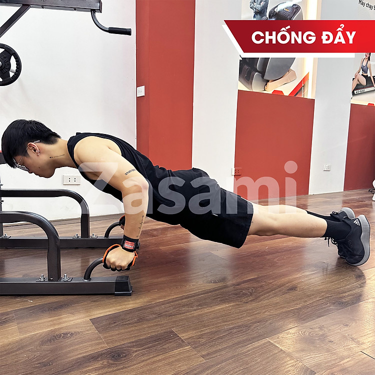 - Chống đẩy: Người dùng ở tư thế plank, nắm lấy tay cầm ở phía dưới, toàn bộ cơ thể từ gót chân tới đầu là một đường thẳng. Từ từ hạ cơ thể xuống, hít vào, sau đó đẩy cơ thể trở về vị trí ban đầu, thở ra. Lặp lại động tác.
