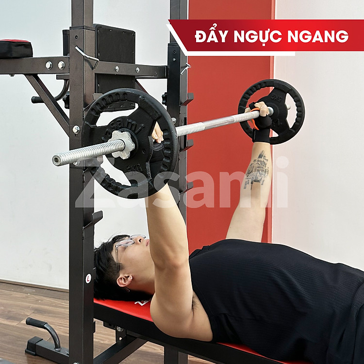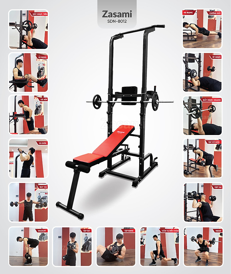 Xà đơn xà kép đa năng Zasami SDN-8012 có thể hỗ trợ nhiều bài tập da dạng: Đẩy ngực (trên, bằng), chống đẩy, xà đơn, xà kép, ke bụng, đẩy vai. Người dùng có thể kết hợp với đòn tạ và tạ đĩa để tập tùy theo khả năng.