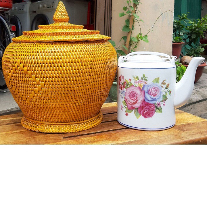 “Bạn sẽ không phải lo ngại vì suốt ngày mất thời gian để đun hay làm nóng nhằm giữ nhiệt lượng nước liên tục khi ủ trà xanh nữa, thay vào đó là việc làm khác đơn giản hơn mà kết quả vẫn ưng ý”. Hãm và ủ ấm liên tục trong thời gian dài trà xanh sẽ giúp những dưỡng chất trong nó ngấm sâu, hòa vào nước và mang lại hương thơm lẫn những hương vị đặc trưng khá riêng biệt. Điều đó đem lại thú vui cho người thưởng thức. Không chỉ là trà xanh, mà ngay cả với lá vối, nhân trần, những loại lá cây dược liệu, nấm linh chi, người ta cũng tận hưởng tinh chất chứa trong nó chỉ bằng việc ủ ấm, hãm nóng. Dưới tác động của lượng nhiệt đều đặn, những tinh chất dần thoát ra ngoài thông qua quá trình ngấm dần dần rồi hòa lẫn vào nước. Điều này hoàn toàn khác biệt với việc bạn đun trực tiếp trong thời gian ngắn thay vì sử dụng ấm giành và ấm tích pha trà xanh nhựa mây tre đan – loại 3L sản phẩm dùng lưu giữ nhiệt để hãm và ủ nước uống. chất liệu bên ngoài là mây tre đan thủ công, bên trong là ấm tích bằng sành sứ, khoảng giữa sử dụng lớp đệm bọc nhung mềm lót bông cao cấp giúp lưu giữ nhiệt được lâu.sức chứa 3L. Mẫu tích sứ về tùy từng đợt hàng mà shop có thể giao mẫu khác nhau nhé khách.