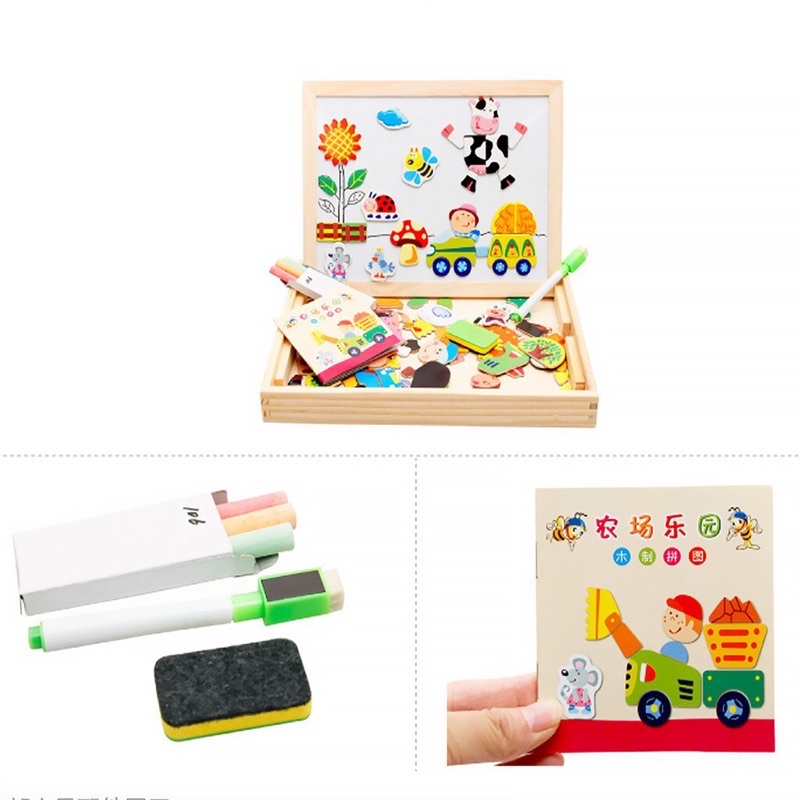 Đồ chơi giáo dục sớm thông minh, bảng gỗ ghép hình nam châm 2 mặt cao cấp có nhiều mảnh ghép kèm bút, phấn, lau bảng
