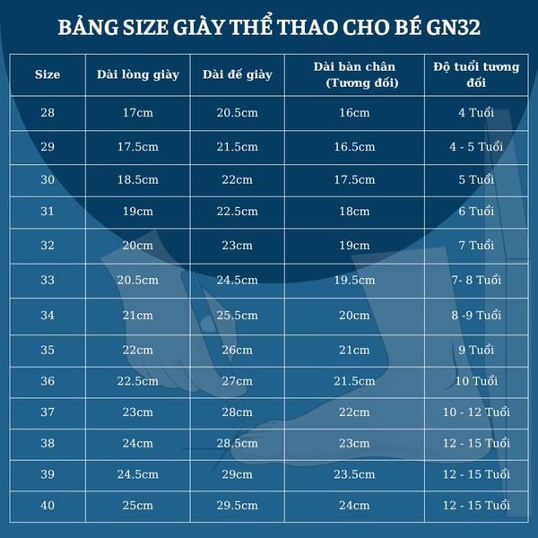BẢNG SIZE GIÀY THỂ THAO BÉ GÁI W.KIDS GN32