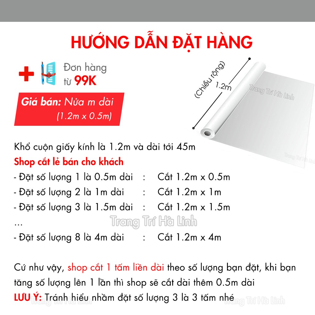 Bảng giá và hướng dẫn mua hàng Vì nhu cầu của nhiều khách ít nên shop bán từ nửa mét dài (Bạn chú ý giúp shop để tránh hiểu lầm ạ). Vì khổ cuộn giấy là 120cm ngang và kéo dài tới 48m dài nên - Khách đặt số lượng 1 lần nghĩa là 50cm dài, thì shop sẽ cắt giấy kính 120cm x 50cm - Nếu đặt 2 lần thì shop cắt 120cm x 100cm ... - Nếu đặt 8 lần thì shop cắt 120cm x 400cm