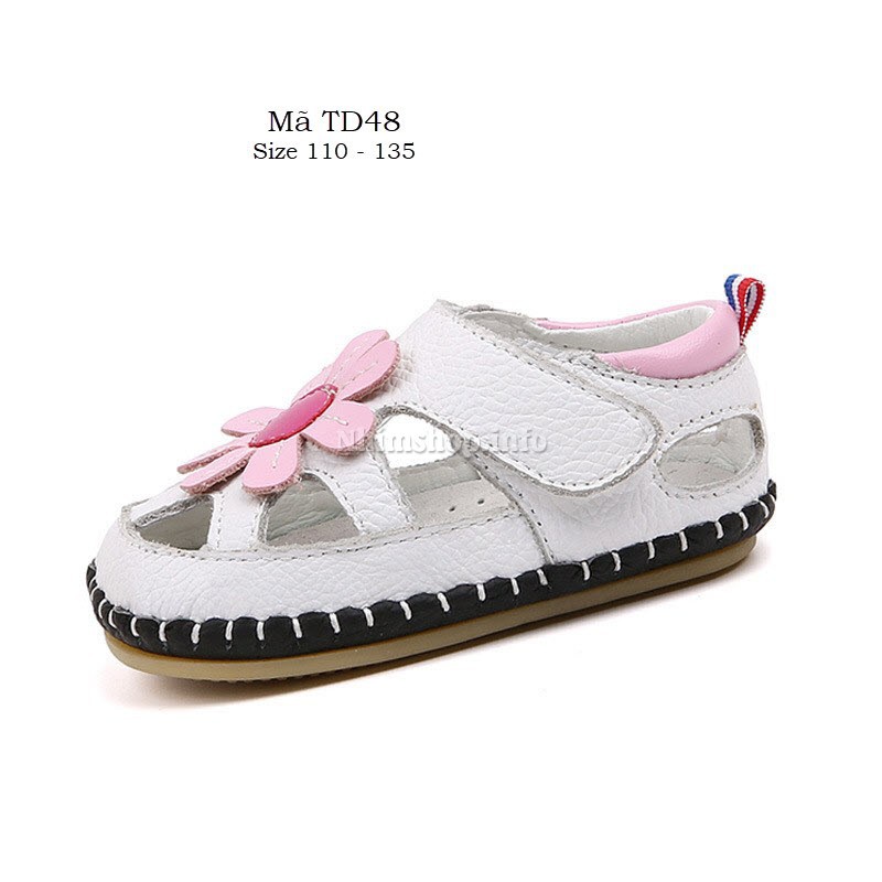 Giày sandal tập đi cao cấp cho bé gái 0 - 18 tháng da mềm đế chống trơn màu trắng dễ phối TD48 là một trong những mẫu giày dép thời trang cho bé được nhiều ba mẹ lựa chọn bởi chất liệu da thật cao cấp mềm mại, kiểu dáng thiết kế tinh tế điểm bông hoa nổi thật xinh và chắc chắn, bít mũi giúp nâng niu bảo vệ đôi bàn chân bé có những bước đi đầu đời thật vững chắc và an toàn. Sản phẩm màu sắc tinh tế, thiết kế size to bé đa dạng phù hợp cho bé 0 – 18 tháng.