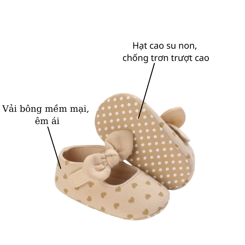 Giày tập đi cho bé gái em đế mềm Bunny Store GTD06 Size: 11 – 11cm 12 – 12cm 13 – 13cm Chất liệu: vải bông Màu Sắc: Màu nâu nhạt, hoa văn Trái tim và Ngôi sao