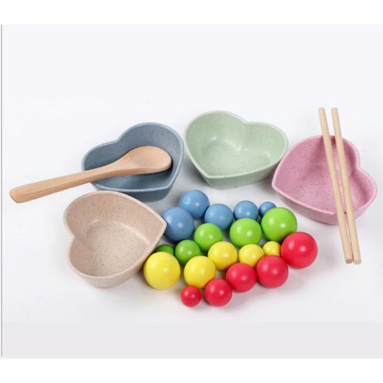 Bộ đồ chơi gồm 4 bát xinh xắn được làm từ lúa mạch, 1 đôi đũa gỗ, 1 chiếc thìa gỗ, những viên bi nhiều màu sắc và kích thước to nhỏ khác nhau và 1 tập thẻ số để bé làm quen với số đếm và phép tính.