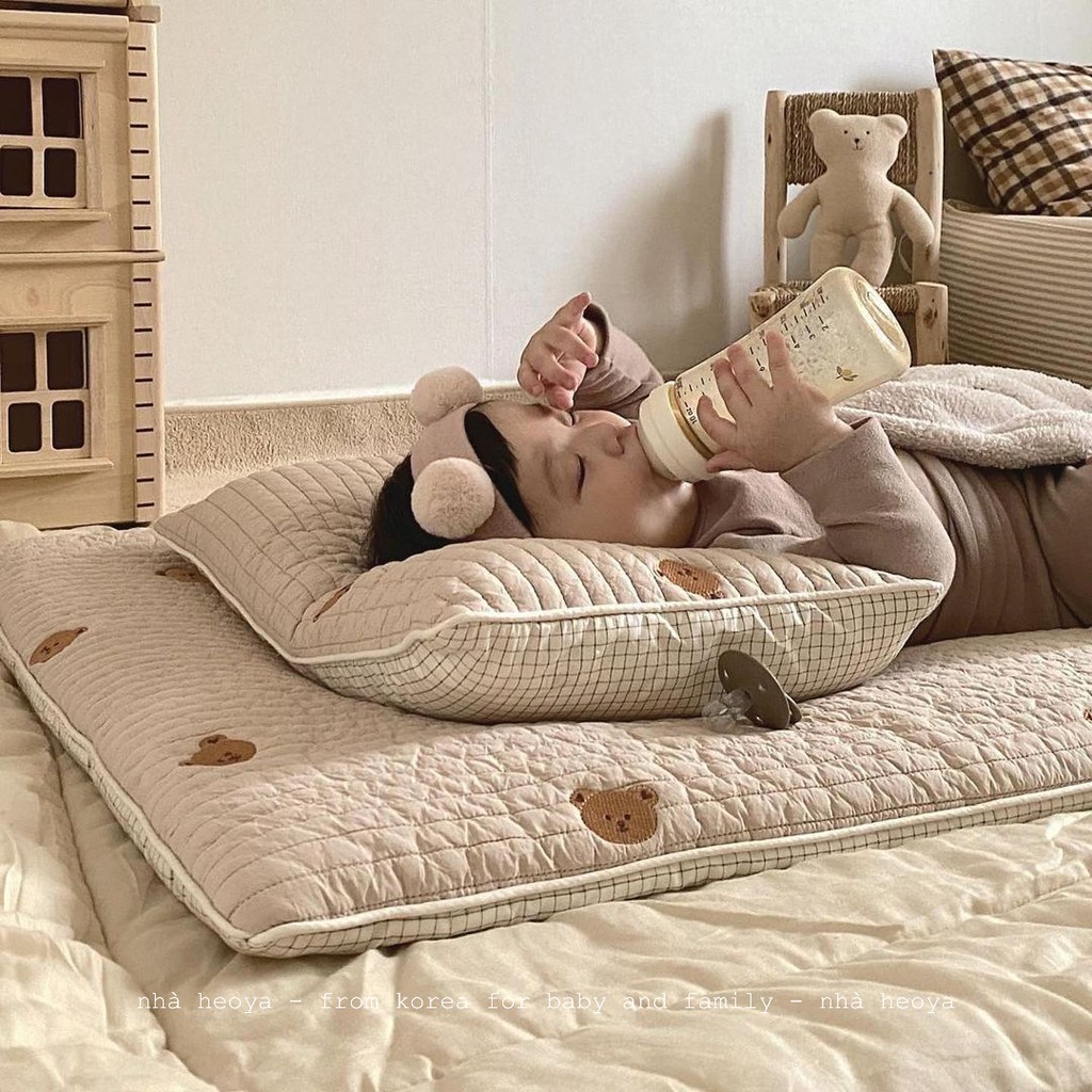 🇰🇷 Gối vốn là cho bé lớn nhưng các mẹ bỉm Hàn sử dụng cho bé từ sơ sinh đến lớn luôn. Bé sơ sinh thì có thể tháo ruột cho nằm vỏ, hoặc là lấy bớt bông của ruột ra cho thấp bớt, nên mẹ đừng lo gối quá cao nha.