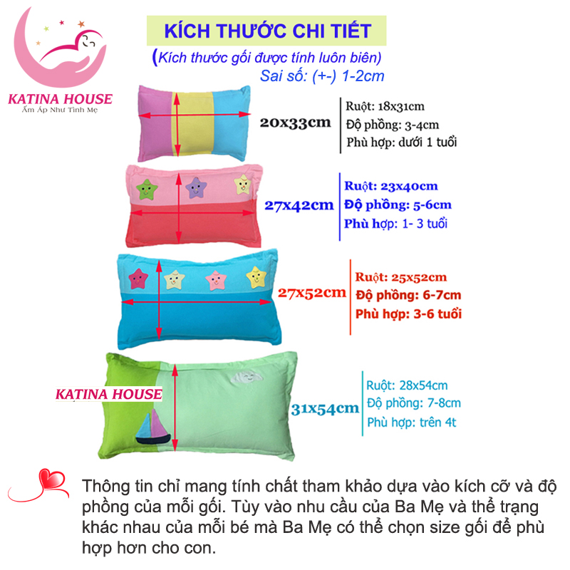 Kích thước | Size 20x33cm: độ phồng gối 4-5cm, phù hợp bé dưới 8 thángSize 27x42cm: độ phồng gối 6-7cm, phù hợp bé 8thang -3 tuổiSize 27x52cm: độ phồng gối 8-9cm, phù hợp cho bé từ 3-6 tuổiSize 31x54cm: độ phồng gối 10-12cm, phù hợp cho bé từ 4 tuổi trở lên |