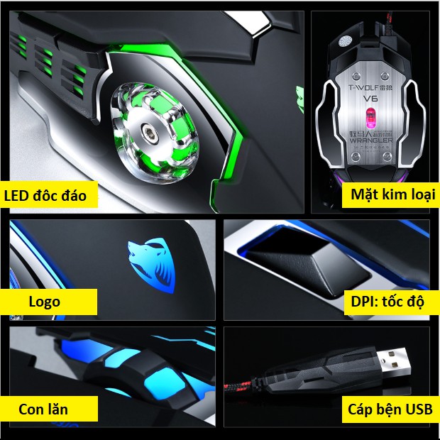 Giới thiệu Chuột dây Free Wolf V6 siêu bền, chuyên game, 3200DPI, full LED, 6 nút bấm - độ nhạy tùy chỉnh