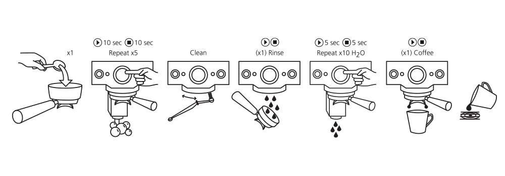 Để vệ sinh hàng ngày, thêm 1 muỗng EVO vào tay cầm nhóm và cho vào như thể pha cà phê espresso. Nếu máy ít được làm sạch, hãy sử dụng 2 muỗng cấp độ.