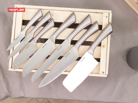 Dao nhà bếp Neoflam gồm 7 con dao: Dao chef, dao chặt, dao santoku nhỏ 5', dao Santoku 7' dao tỉa, dao gọt, dao cắt bánh mì. Bộ dao đầy đủ cho một căn bếp để chế biến mọi loại thực phẩm. Lưỡi dao bằng thép các bon cao 3CR14, Cán dao bằng inox 430 sáng bóng và sạch sẽ