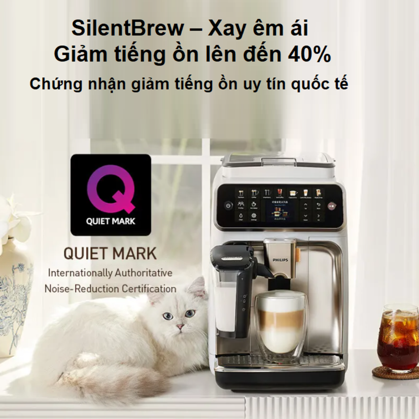 - Công nghệ SilentBrew giúp giảm tiếng ồn khi máy hoạt động, để bạn tận hưởng trải nghiệm pha cà phê yên tĩnh hơn. Nhờ lớp cách âm và cấu trúc giảm ồn, tiếng ồn giảm 40% so với các mẫu đời trước và đạt chứng nhận QuietMark.**