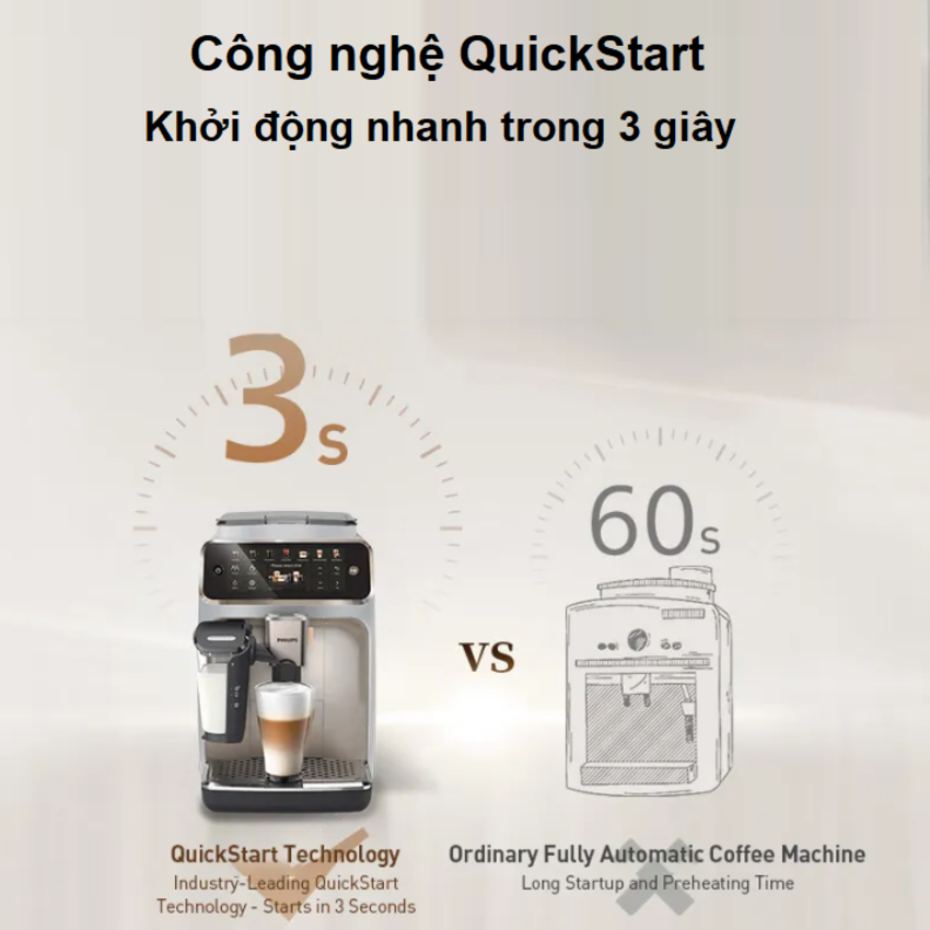 - Không cần đợi máy làm nóng trước. Công nghệ QuickStart cho phép bật máy và pha ngay, tiện lợi và nhanh chóng hơn.