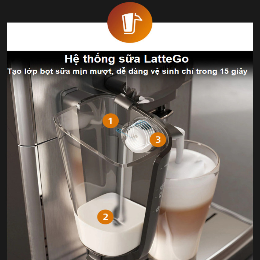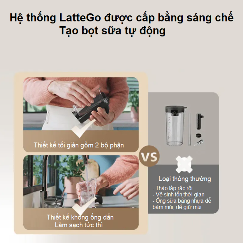 - Hệ thống đánh sữa LatteGo không ống dẫn, dễ vệ sinh và tháo lắp
