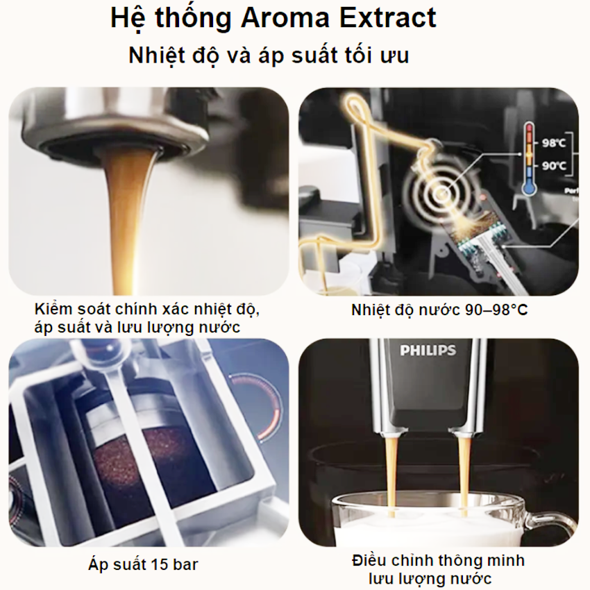 - Công nghệ pha chế Aroma Extract của Philips EP1221/69 mang đến sự cân bằng hoàn hảo giữa nhiệt độ pha và chiết xuất hương thơm, giúp tạo ra những tách cafe đậm đà và thơm ngon. Hệ thống này duy trì nhiệt độ nước ổn định từ 90°C đến 98°C, đồng thời điều chỉnh lưu lượng nước để tối ưu hóa quá trình chiết xuất, đảm bảo hương vị cafe được phát triển đầy đủ. Kết quả là mỗi tách cafe đều c ó hương thơm ngào ngạt và lớp crema mịn màng, hoàn hảo.