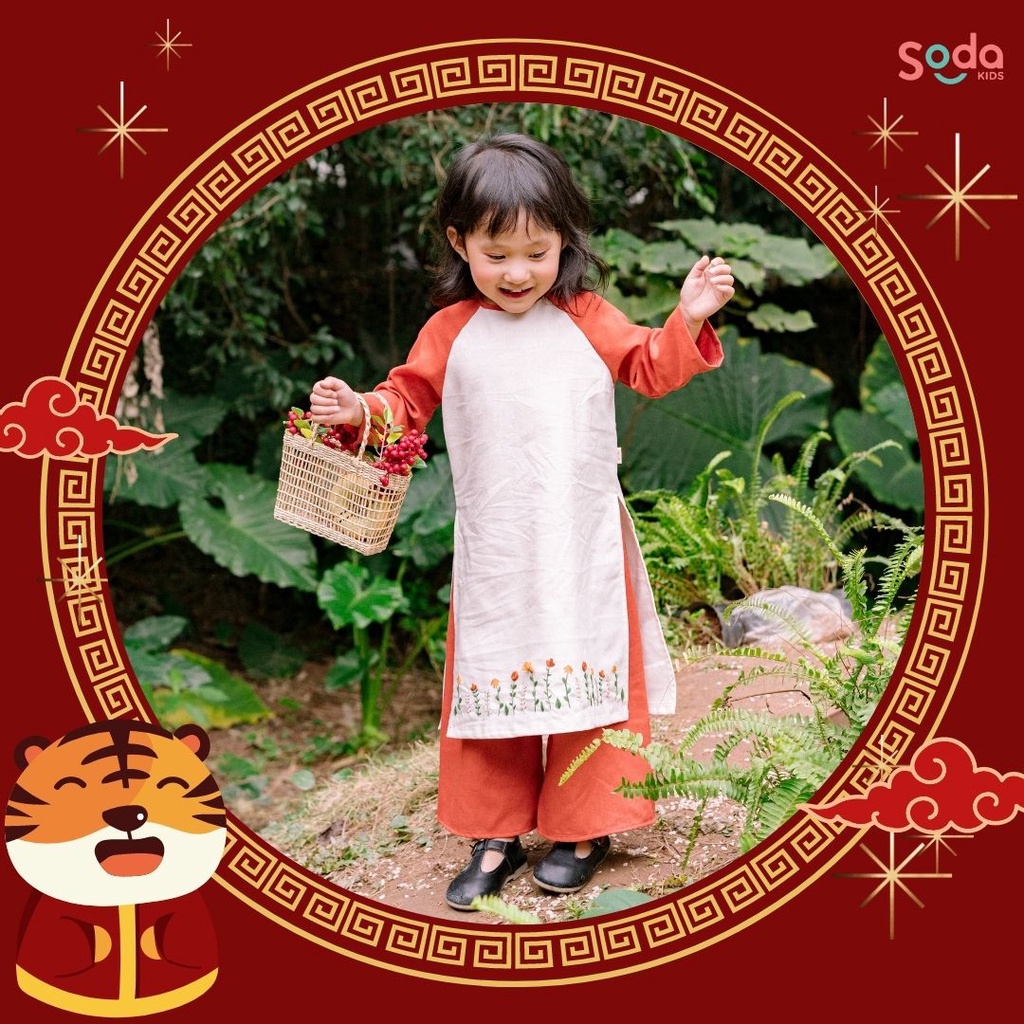♥️ CHẤT LIỆU ÁO DÀI SODA KIDS: - Tà áo dài với sắc cam nổi bật điểm xuyết những bông hoa nhí thêu tay tinh tế. - Chất liệu: Vải Linen mềm mại kết hợp hoa thêu tay độc quyền của Soda Kids