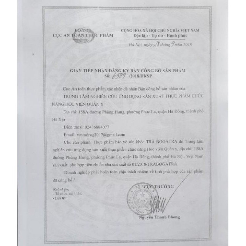 Trà Bogatra là trà giải độc gan có thành phần thảo dược thiên nhiên, an toàn hiệu quả khi sử dụng. Trà bogatra được sản xuất bởi Trung tâm nghiên cứu ứng dụng sản xuất thực phẩm chức năng Học Viện Quân Y. Các thành phần thảo dược trong trà Bogatra * Cà gai leo ……………………………..500mg * Diệp hạ châu đắng.………..…….300mg * Actiso ……………………………………200mg * Kim ngân hoa …………………….. Công dụng của trà Bogatra Học Viện Quân Y * Giúp thanh nhiệt, lương huyết, giải độc gan, hạ men gan * Tăng cường chức năng gan trong các trường hợp viêm gan, suy giảm chức năng gan * Giúp chống vàng da, mụn nhọt, giảm mỡ trong gan, giảm mề đay. Đối tượng sử dụng : * Các trường hợp suy giảm chức năng gan, men gan tăng cao do viêm gan, xơ gan, * Người bị gan nhiễm mỡ gây vàng da, vàng mắt, nước tiểu vàng đục, chán ăn, mệt mỏi. * Người uống nhiều bia rượu, đồ uống có cồn. * Người sử dụng thuốc dài ngày, người mới ốm dậy. Cách dùng & liều dùng: Nhúng túi trà vào trong cốc nước chứa khoảng 100 – 150 ml nước sôi, chờ 3 – 5 phút. Ngày dùng 3 – 5 túi. Sản phẩm này không phải là thuốc, không có tác dụng thay thế thuốc chữa bệnh