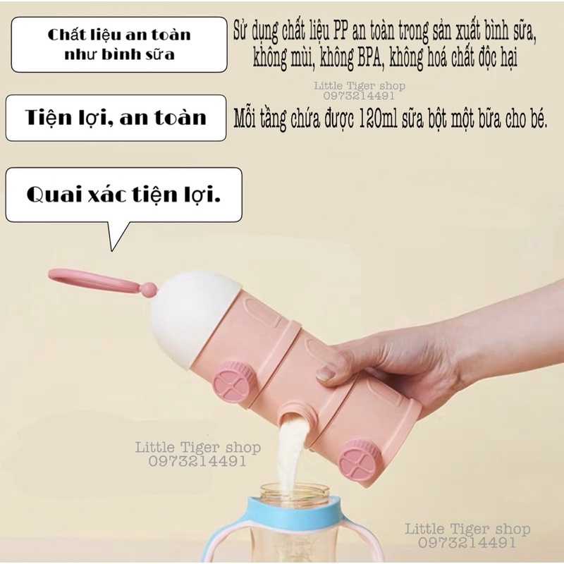 Từ nay mỗi lần ra ngoài, các mẹ không cần phải vác theo hộp sữa to đùng lỉnh kỉnh nữa rồi ạ. Các mẹ chỉ cần chia vào các hộp nhỏ, mỗi lần pha sữa vặn nắp đổ vào bình là xong! Bé ở nhà với bà hay đi lớp, mẹ chia sẵn vào hộp gửi bà gửi cô tiện lợi vô cùng luôn ạ, lại không cần phải lo lắng mọi người có đong sữa đúng chuẩn hay không nữa. ♥ Thiết kế loại 3 tầng và 4 tầng mở từng ngăn sạch sẽ, tiện lợi. Ngoài sữa bột, mẹ có thể đựng cả trái cây, đồ ăn nhẹ cho bé nữa. ♥ Chất liệu PP an toàn dùng trong sản xuất bình sữa, thân thiện với môi trường ♥ Không chứa BPA, không mùi và hóa chất độc hại. ♥ Dung tích lớn 120ml mỗi tầng đủ lượng sữa cho 1 em bé lớn ♥ Quai cầm mềm mại, chắc chắn, thuận tiện khi mang ra ngoài. ♥ Thiết kế nhỏ xinh, dễ dàng cất gọn vào túi xách, ba lô. ♥ Chịu được nhiệt độ lên tới 110°C, tiệt trùng được bằng nước sôi. ♥ Hai màu xanh và hồng như ảnh.