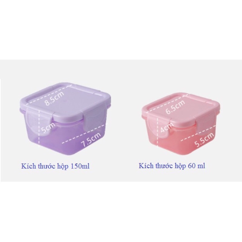 THÔNG TIN SẢN PHẨM --------------------------------- - Kích thước - Loại 60ml: 5 x 5 x 4 cm - Loại 150ml 7,5 x 8,5 x 5cm - Có nắp có khóa 4 cạnh bảo quản và gioăng cao su chống rò rỉ - Làm từ nhựa PP cao cấp, không chứa PBA chịu được nhiệt độ từ -20 độ C đến 110 độ C - Hộp trữ đông,khay trữ đông rất thích hợp để mẹ cất trữ khẩu phần ăn dặm riêng biệt cho con theo từng bữa (đặc biệt với các mẹ theo phương pháp ăn dặm kiểu Nhật).