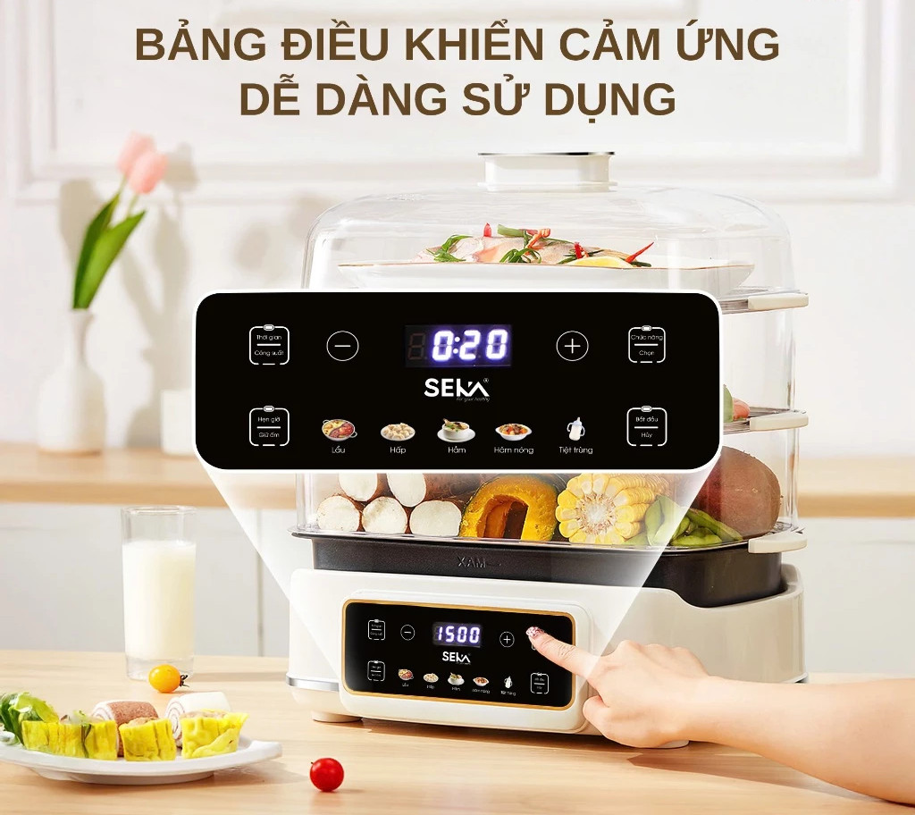 Nồi lẩu hấp Seka sử dụng bảng điều khiển cảm ứng với các chức năng nấu đa dạng. Màn hình led hiển thị thời gian nấu. Bạn có thể chọn các chức năng : lẩu, hấp, hầm, tiệt trùng, hâm nóng.
