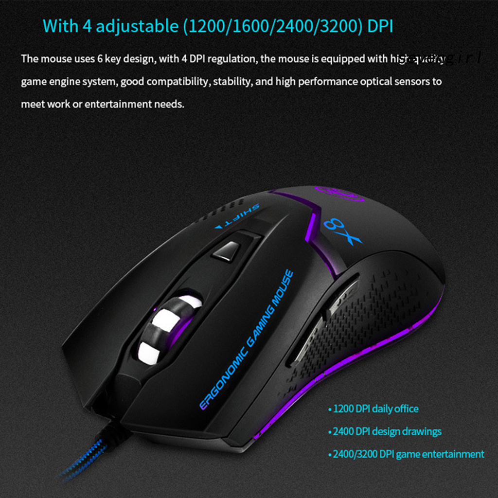 Item Name: Wired Mouse Material:ABS Connection Type: Wired USB Resolution: 1200-1600-2400-3200DPI Number of Keys: 6 Buttons Operation Mode: Photoelectric Wireless Transmission Frequency: 2.4GHz Breathing Lamp: LED Colorful Automatic Breathing Light Size:13.2cmx7.2cmx4.3cm/5.2inx2.83inx1.69in