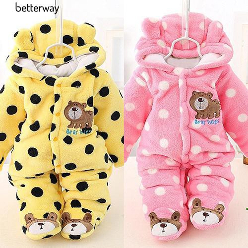 Specifications: Cute bear dot pattern design, your baby will like it very much. Special hooded romper jumpsuits design, easy to take off and on. Great for winter warm keeper wear.