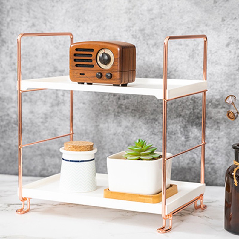 1. Made of high quality wrought iron and durable PP, with elegant design, rose gold iron combined with white PP, makes it not only a storage rack, but also is suible for home decoration 2. Perfect Design, Designed with practical divisions, you can display your books, collectables or small plants perfectly and orderly. 3. Flat surface and sturdy constructure, excellent craftsmanship process, perfect for placing office supplies, documents, books, and plants. 4. DIY Assembled, you layers as you need, and adjust the PP board according to your articles. Size: 2 Layers: 24.8x16.8x28cm (LxWxH) Model Number: storage rack 0824 Installation Type: Floor Type Classification: Non-folding Rack Use: Sundries Applicable Space: Bathroom Feature: Eco-Friendly Category: bathroom organizer Application: bathroom, kitchen, office Usage: store cosmetics, seasoning, shampoo colour:Rose gold Material:Iron + ABS Package Contents: 1 * spice rackOnly the above package content, other products are not included. Note: Light shooting and different displays may cause the color of the item in the picture a little different from the real thing. The measurement allowed error is +/- 1-3cm.