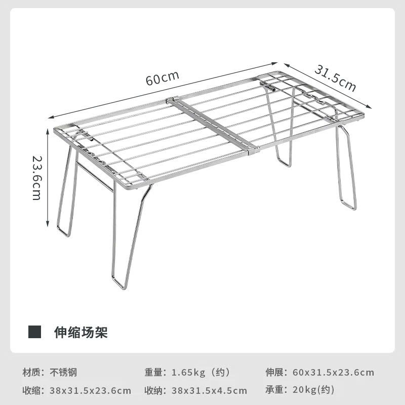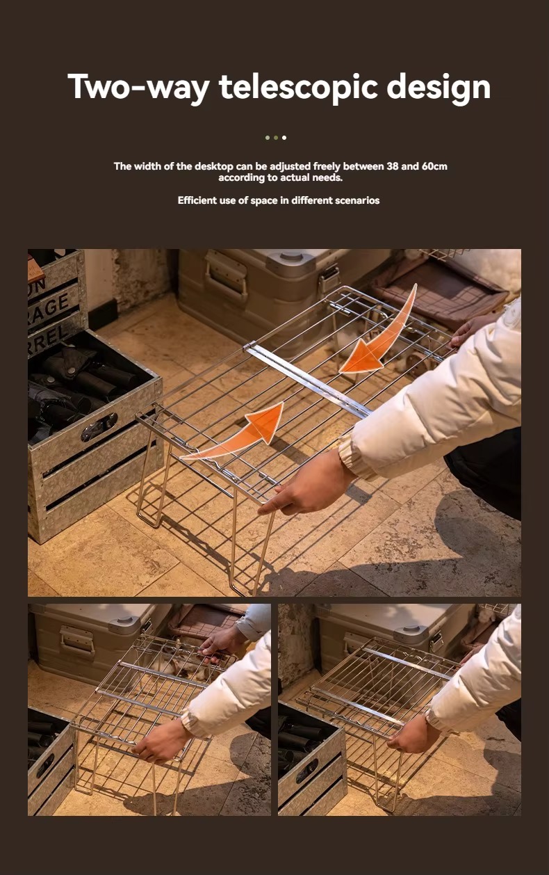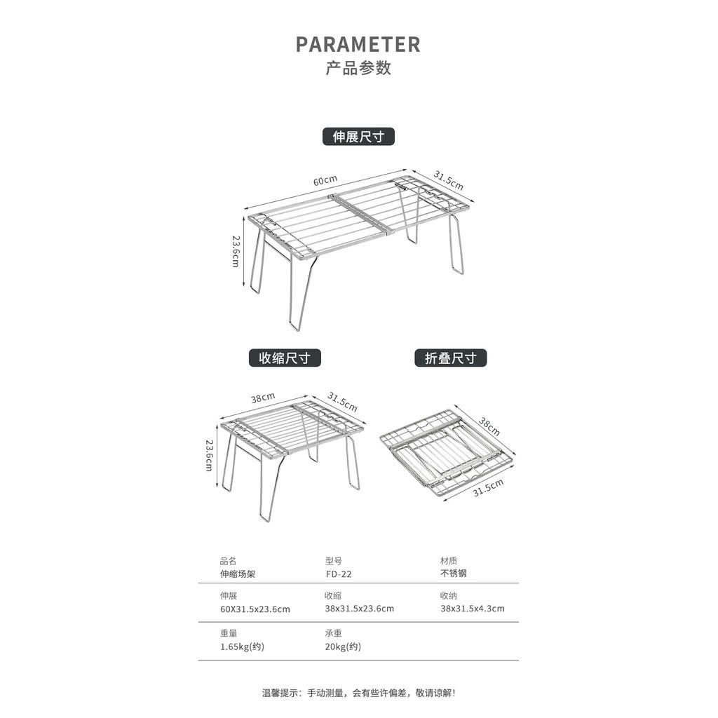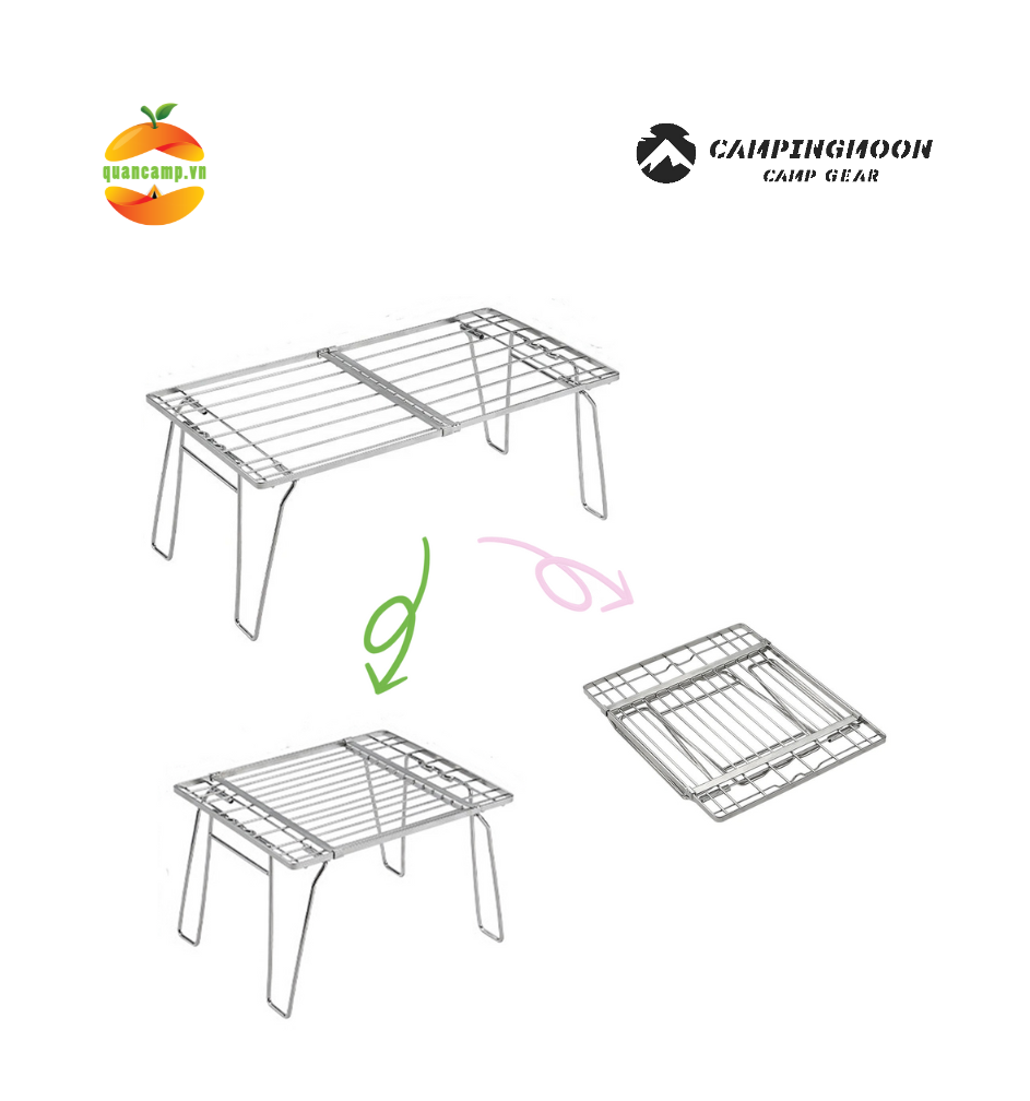 Kệ thép không gỉ Campingmoon FD-22 có khả năng thu gọn hoặc mở rộng chỉ bằng vài thao tác đơn giản, cực kỳ tiện lợi để tùy chỉnh diện tích sử dụng theo từng không gian cắm trại, picnic hoặc sử dụng trong sinh hoạt hàng ngày.