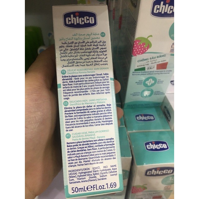 - Kem đánh răng Chicco được đặc chế với công thức an toàn, không chứa Flouride, không cay, thích hợp cho việc chăm sóc răng miệng của bé. Fluoride là hoạt chất chống sâu răng mạnh nên có thể gây mài mòn, làm hỏng men răng sữa của Bé. Flouride còn gây ra các tác động khác tới hệ thần kinh của trẻ nên hiện hoạt chất này được các Bác sỹ Nhi khoa Quốc tế khuyến cáo không sử dụng cho trẻ dưới 3 tuổi.