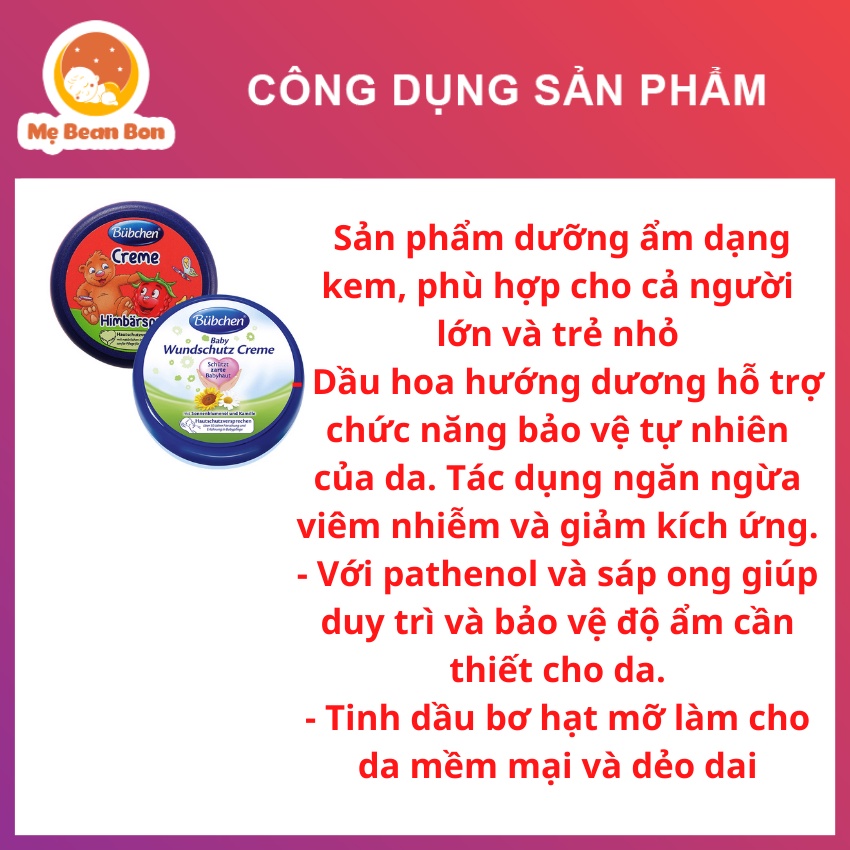 B. Công dụng kem nẻ Bubchen Creme Sản phẩm dưỡng ẩm dạng kem, phù hợp cho cả người lớn và trẻ nhỏ - Dầu hoa hướng dương hỗ trợ chức năng bảo vệ tự nhiên của da. Tác dụng ngăn ngừa viêm nhiễm và giảm kích ứng. - Với pathenol và sáp ong giúp duy trì và bảo vệ độ ẩm cần thiết cho da. - Tinh dầu bơ hạt mỡ làm cho da mềm mại và dẻo dai