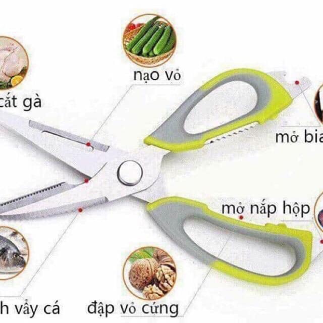 + Đa công dụng : Kéo đa năng 10 in 1 Mighty Shears có thể cắt thịt gà ,bào vỏ trái cây ,khui bia ,tách vỏ cua,vỏ quả óc chó ,đánh vảy cá ,khui nắp hộp ,cắt túi nylon ,v.v…