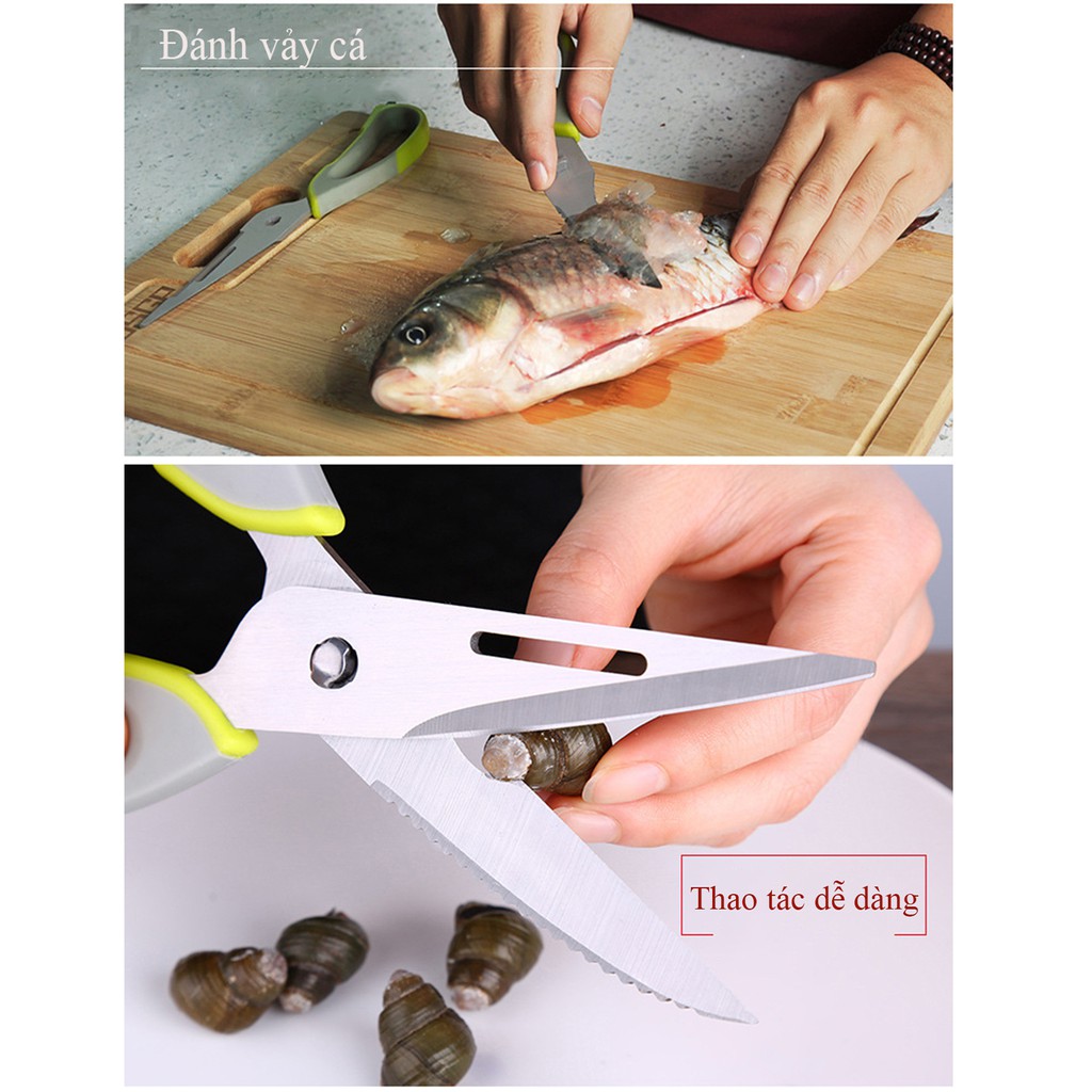 THUẬN TIỆN – CHẤT LƯỢNG – CÓ THỂ THÁO RỜI – DỄ DÀNG VỆ SINH Kéo nhà bếp đa năng SSGP được làm từ thép 420 cao cấp. Có thể chịu được áp lực cao và tải trọng lớn. Sản phẩm được gia cố chắc chắn, kỹ lưỡng đến từng chi tiết nhỏ nhất kết hợp với công nghệ hợp kim từ Đức giúp chiếc kéo vô cùng sắc bén và mạnh mẽ. Chất liệu thép 420 có khả năng chống ăn mòn tốt, an toàn khi tiếp xúc với các loại thực phẩm. Thương hiệu: SSGP - tiêu chuẩn chất lượng Đức Kích thước: 23x7cm Trọng lượng: 143g Ưu điểm: 1. Tay cầm được làm từ nhựa PP cao cấp kết hợp với cao su NBR. Tạo cảm giác mềm mại và dẻo dai khi cầm nắm. Không gây đau, mỏi tay khi sử dụng lâu. 2. Công nghệ mài dũa hiện đại nhất giúp lưỡi kéo vô cùng săc bé và bền bỉ. Các bánh răng được phân bố đều tránh tình trạng trơn trượt khi cắt các loại thực phẩm sống. Thân của lưỡi kéo được thiết vô cùng dày dặn giúp tăng tuổi thọ của kéo. 3. Chốt đinh giữa kéo được thiết kế có thể tháo rời. Xoay kéo 1 góc 90 độ, chiếc kéo có thể được tháo rời ra và sử dụng như một con dao. Dễ dàng làm sạch sau khi tháo rời, không lo bụi bẩn. 4. Chiếc kéo được thiết kế vô cùng thông minh có thể sử dụng với nhiều công việc như: cắt xương gà, vịt, róc vảy cá, gọt vỏ củ quả, tách vỏ các loại hạt cứng, khui nắp bia, mở nắp các loại đồ hộp... chuyển đổi linh hoạt, dễ dàng sử dụng vào nhiều mục đích khác nhau.