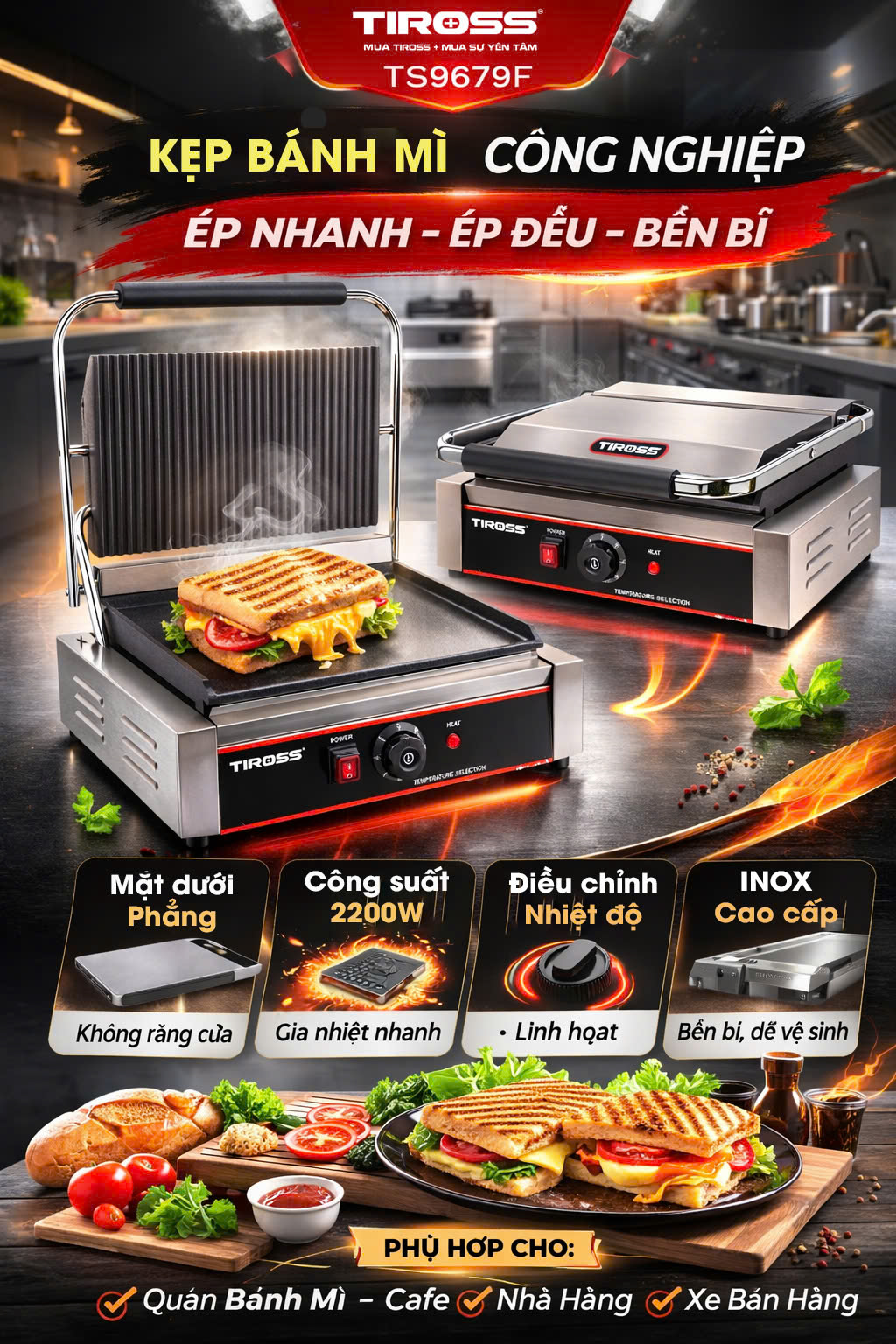 • Mặt nướng: được tạo rãnh, 1 mặt rãnh, 1 mặt phẳng