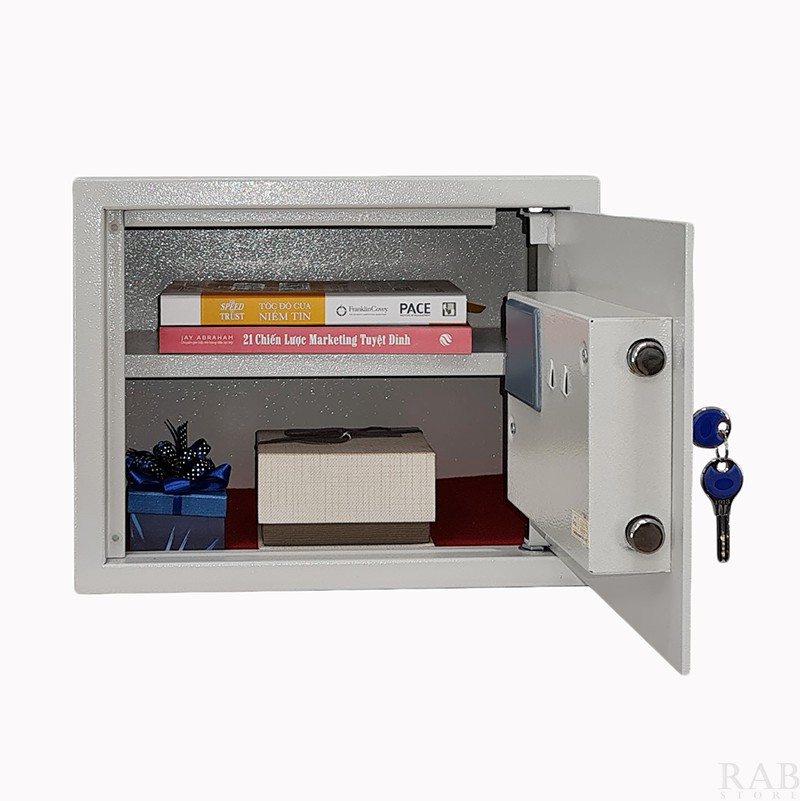 - ĐẶC ĐIỂM & CHỨC NĂNG: + Đóng mở bằng mã số và chìa khóa khẩn cấp. + Cấu tạo bởi những lớp thép dày vững chắc chống cạy phá. + Công nghệ sơn tỉnh điện 2 lớp chống oxy hóa, bền đẹp theo thời gian. + 2 ngăn để đồ riêng biệt. + Màn hình hiện thị LCD đa chức năng: Báo chống trộm (nhập sai mã, chịu sự tác động bên ngoài). + Chống dịch chuyển két sắt với thiết kế bắt vít cố định dưới đáy và sau lưng két. + Truy xuất dữ liệu hoạt động két trên 50 lần đóng mở gần nhất. + Thích hợp cất giữ các vật dụng cá nhân có giá trị.