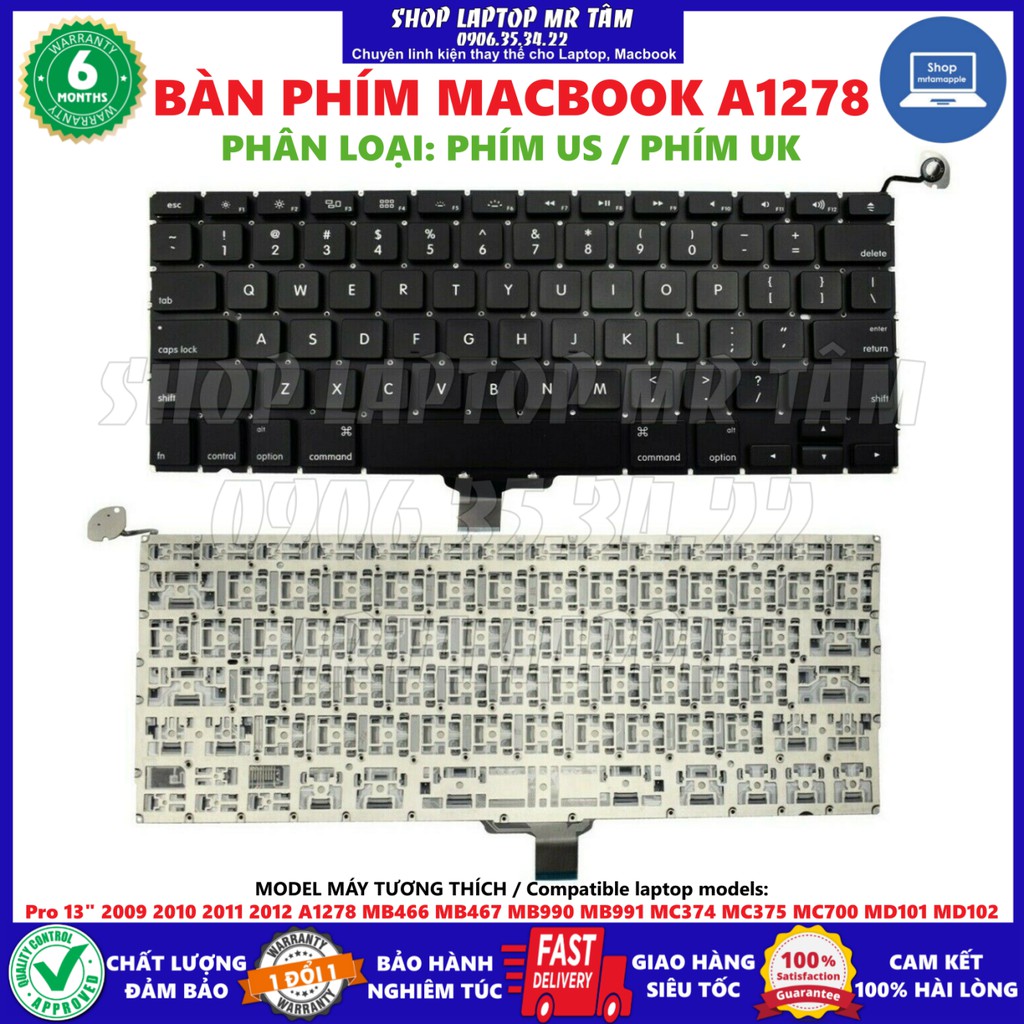 (KEYBOARD) BÀN PHÍM LAPTOP MACBOOK A1278 tương thích dùng chung cho các model laptop sau / Fit for: Pro 13" 2009 2010 2011 2012 A1278 MB466 MB467 MB990 MB991 MC374 MC375 MC700 MD101 MD102 ✔️========= Cảm ơn và Chào mừng Quý Khách đã ghé thăm gian hàng của ✔️Shop Laptop Mr Tâm✔️ (English language customers are fully supported) Shop chuyên kinh doanh linh kiện thay thế cho LAPTOP và MACBOOK. Chúc bạn tham quan và order vui vẻ. Shop Laptop Mr Tâm (mrtamapple) CAM KẾT: ✔️Bán sản phẩm đúng mô tả chất lượng. ✔️Luôn TEST SẢN PHẨM hoạt động tốt bằng board test chuyên dụng trước khi đóng gói. ✔️Đóng gói sản phẩm bằng hộp giấy carton cứng CHUẨN CHỐNG SỐC, CHỐNG NƯỚC có TEM SEAL NIÊM PHONG bên ngoài hộp để đảm bảo đúng và đủ hàng không bể vỡ. ✔️Giao hàng nhanh chóng đến đơn vị vận chuyển. ✔️Hỗ trợ giao hàng HỎA TỐC 4H (TP.HCM). ✔️Bảo hành sản phẩm (1 đổi mới 1) nghiêm túc, đổi trả nhanh gọn hậu bán hàng. ✔️Tư vấn khách chọn mua đúng hàng nhiệt tình, vui vẻ, thân thiện. ✔️Khách mua hàng online an toàn và hài lòng. KHUYẾN KHÍCH: ✔️Khách hàng QUAY LẠI VIDEO MỞ HỘP SẢN PHẨM để khiếu nại nếu có sự cố sản phẩm do quá trình vận chuyển. ✔️Giữ lại hộp đựng sản phẩm 07 đầu sau khi nhận hàng (mua nhầm, đổi trả...). ========= THÔNG TIN SẢN PHẨM: Loại bàn phím: BÀN PHÍM LINH KIỆN THAY THẾ Hình thức: BÀN PHÍM MỚI (chưa qua sử dụng). Tình trạng: Hoạt động tốt. (test kỹ trước khi đóng gói). Bảo hành: 06 tháng (1 đổi mới 1). ⚠️LƯU Ý: PHÂN LOẠI BÀN PHÍM LAPTOP SHOP ĐĂNG BÁN MẶC ĐỊNH NẾU TÊN SẢN PHẨM, PHÂN LOẠI SẢN PHẨM HOẶC MÔ TẢ SẢN PHẨM KHÔNG ĐỀ CẬP ĐẾN SẼ LÀ: ✔️BÀN PHÍM MÀU ĐEN. ✔️BÀN PHÍM KHÔNG CÓ ĐÈN LED. ✔️BÀN PHÍM KHÔNG BAO GỒM CÁP TRẮNG NHỎ (CÁP CỦA NÚM CHUỘT TRACKPOINT GIỮA BÀN PHÍM HOẶC CÁC LOẠI CÁP PHỤ KHÁC) CỦA MỘT SỐ DÒNG MÁY LAPTOP DELL, HP, LENOVO... ========= LƯU Ý TRƯỚC KHI ĐẶT MUA:⚠️⚠️⚠️ ✔️Hàng điện tử KHÔNG ĐỒNG KIỂM khi nhận hàng. Vui lòng kiểm tra thông tin chính xác (số phone, địa chỉ…) trước khi bấm mua hàng tránh phát sinh lỗi giao đơn hàng. QUÝ KHÁCH TÌM XEM VÀ SO SÁNH KỸ GIỮA BÀN PHÍM LAPTOP GỐC VÀ BÀN PHÍM CỦA SHOP BÁN THAY THẾ CÁC ĐẶC ĐIỂM SAU: ✔️HÌNH DÁNG NÚT ENTER (NÚT ENTER NẰM NGANG, HOẶC NÚT ENTER HÌNH SỐ 7) nếu là dòng BÀN PHÍM ÂM (loại phím phải lắp vào khung/vỏ máy có sẵn của laptop). ✔️CÁP PHÍM: độ rộng, chiều dài, vị trí. ✔️CHÂN ỐC: số lượng, vị trí. ✔️CHAT VỚI SHOP NẾU: + Bạn vẫn chưa chắc chắn đúng loại bàn phím (gửi cho shop hình ảnh bàn phím mặt trước mặt sau, hình model máy laptop, mã part number bàn phím ...) + Bạn cần thêm thông tin về sản phẩm muốn mua. + Bạn tìm sản phẩm cần mua trong Shop mà chưa thấy. ✔️GỌI NGAY: 0906.35.34.22 Mr Tâm✔️ nếu có sự cố về đơn hàng (giao nhận, bễ vỡ...), sản phẩm (lắp đặt, sử dụng...) đang khi hoặc sau khi nhận hàng để shop được hỗ trợ bạn nhanh và kịp thời.