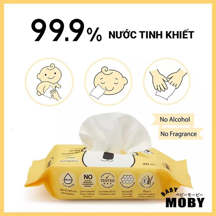 KHĂN ƯỚT TINH KHIẾT MOBY 99,9% - Là món đồ siêu tiện dụng nhưng khăn giấy ướt cũng là sản phẩm mẹ phải "đau đầu" lựa chọn. Đặt yếu tố an toàn và tiện lợi lên hàng đầu, khăn ướt Moby sản xuất tại Singapore chính là thứ đồ luôn-phải-có trong túi đồ của mẹ và bé với: - Thành phần chứa 99,9% là nước tinh khiết - KHÔNG chất tạo mùi, KHÔNG cồn, KHÔNG Paraben và chất huỳnh quang - Vitamin E và chiết xuất lô hội giúp dưỡng ẩm cho làn da - Sợi vải siêu dày và mềm mại, không để lại sợi bông khi lau và không làm xước hay gây kích ứng da bé - Kỹ thuật dệt tổ ong 3D giúp giữ độ ẩm lâu hơn khăn giấy thông thường - ĐẶC BIỆT, sản phẩm đã được kiểm nghiệm da liễu, có giấy chứng nhận FDA số 10-2-5920415 - Số lượng: 80 tờ/ gói