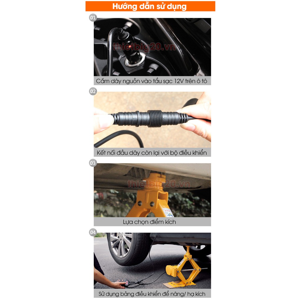 Hướng dẫn sử dụng kích nâng ô tô tự động kiểu cắt kéo Bước 1: Cắm dây nguồn vào tẩu sạc 12V trên ô tô Bước 2: Kết nối dầu dây còn lại với bộ điều khiển Bước 3: Lựa chọn điểm kích Bước 4: Sử dụng bảng điều khiển để nâng hạ kích