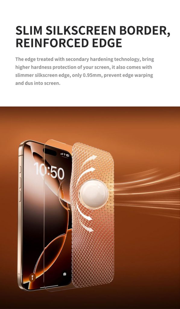 Công nghệ xử lý cạnh bằng quy trình làm cứng thứ cấp không chỉ tăng cường độ bền cho viền kính mà còn tạo ra viền lụa mỏng vô cùng tinh tế. Thiết kế này giúp ngăn ngừa tình trạng cong vênh và bụi bẩn bám vào các cạnh màn hình, giữ cho thiết bị của bạn luôn sạch sẽ.