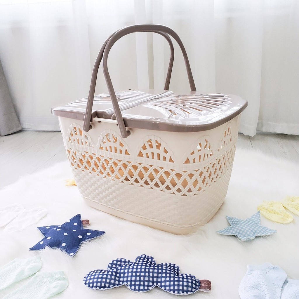 GIỎ ĐỰNG ĐỒ CHO MẸ VÀ BÉ - Chiếc giỏ nhỏ gọn, có quai sách tiện lợi có thể để ngay trên giường để mẹ có thể lấy đồ thay cho bé một cách dễ dàng. - Được làm từ nhựa PP an toàn cho bé. - Có 2 nắp đóng, mở khi lấy và cất quần áo. - Thiết kế rộng rãi để gấp gọn quần áo của bé gọn gàng không bị nhăn nhúm. - Màu sắc: hồng, xanh, kem kích thước : 42x31x27cm
