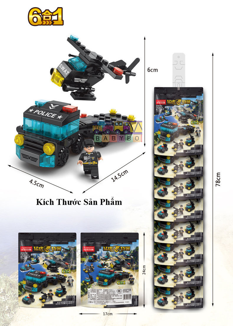 Bộ đồ chơi lắp ráp chủ đề cảnh sát đặc nhiệm SWAT mang đến trải nghiệm vừa học vừa chơi thú vị cho bé. Với thiết kế thông minh, bộ sản phẩm có thể biến hóa 7 kiểu mô hình khác nhau như: xe tuần tra, trực thăng, cano, máy bay do thám, v.v...