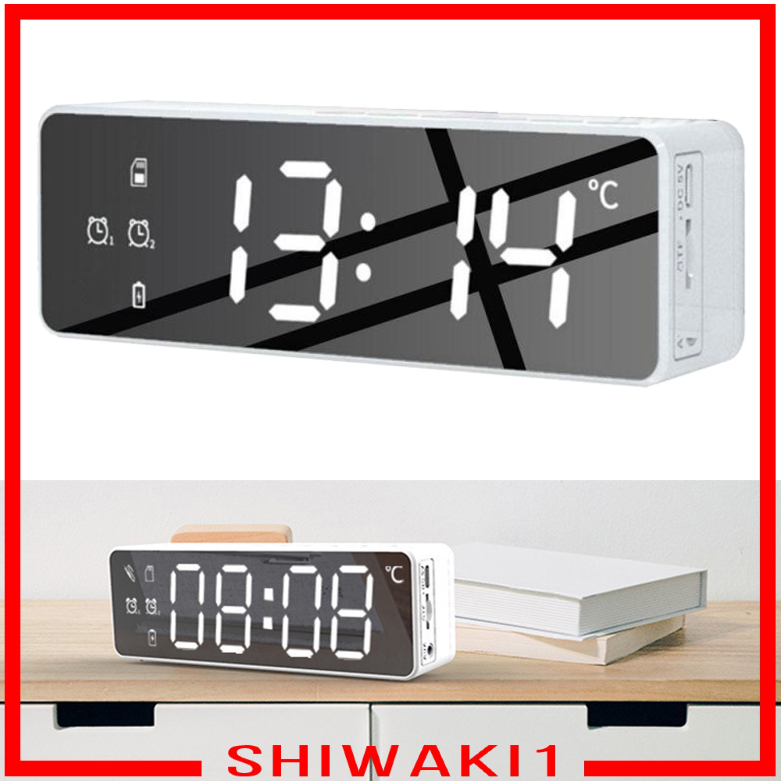 Description: Large LED Display: Features a large LED mirror display making it easy to read; supports 3 levels of screen brightness adjustment, clear and comfortable visual sense. USB Powered: Included a charging USB cable for convenience for powering for long music playing time. Stable Connection: It uses a high-performance Bluetooth 5.0 smart chip to make the connection simple, fast and stable. The connection range is up to 10m. Multiple Connection Methods: Support TF card playback, AUX audio cable connection playback, Bluetooth connection playback, it can be connected to various mobile phones, tablets, TVs and other devices. Stylish and Simple Design: Decorate your home bedroom, living room bedside, office table desk, but also can be used as a mirror when needed! Specification: Material: ABS Plastic Size: Approx. 150x47x32mm/5.90x1.85x1.25inch Function: Bluetooth audio / clock / alarm clock / radio / temperature display / TF card reading Display: Digital LCD display Bluetooth version: Bluetooth 5.0 Temperature: real-time room temperature Brightness: 3 adjustable levels Alarm clock: 2x alarm clocks can be configured Charging interface: MICRO USB products Package Includes: 1 Piece Speaker 1 Piece Charging Cable Note: Color might be slightly different due to the color calibration of each individual monitor. Please allow slightly measuring deviation due to manual measurement.