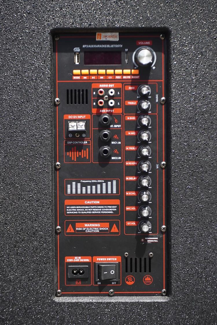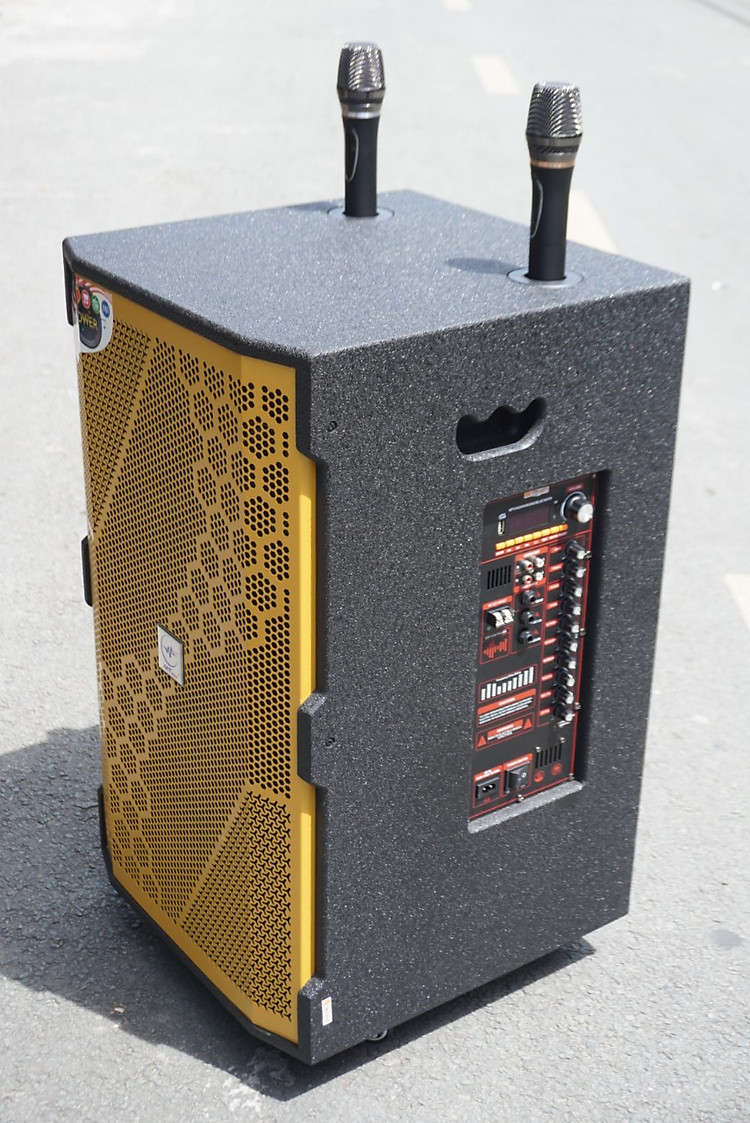 Bên trên mặt loa là bảng mạch chứa các nút vặn và các cổng kết nối rất dể dàng sử dụng. Hai tay micro không dây được trang bị thêm có chỗ để gọn gàng, sử dụng dễ dàng, chất lượng.