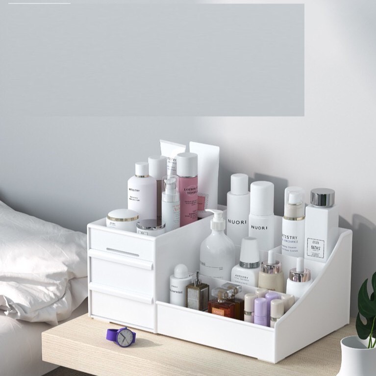 Hàng sẵn kho SLL - Kệ để đồ mỹ phẩm đa năng được làm bằng chất liệu nhựa an toàn, được thiết kế hợp lý với 3 tầng, 2 ngăn . Hộp kích thước lớn, có thêm ngăn kéo, để được nhiều đồ tiện dụng. - Sản phẩm rất tiện lợi để bạn cất giữ và bảo quản đồ trang sức, mỹ phẩm. Các ngăn chứa có kích thước khác nhau, giúp xếp đồ ngăn nắp, gọn gàng. - Các chi tiết của hộp được gia công tỉ mỉ, gãy gọn, không bị gợn, thừa. - Màu sắc trang nhã, nữa tính, phù hợp với mọi lứa tuổi. – Chất liệu: nhựa dẻo cao cấp – Màu sắc: xanh biển, xanh cốm, hồng ,tím – Kích thước: Sản phẩm: 28.5×17.8×13.5x5cm