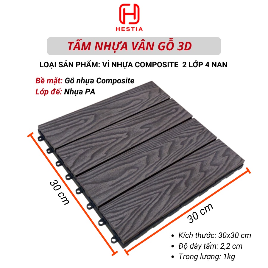 VỈ NHỰA LÓT SÀN VÂN GỖ 3T - TẤM LÓT SÀN 2 LỚP 4 NAN NHỰA COMPOSITE - SẢN PHẨM CAO CẤP SANG TRỌNG - THỜI THƯỢNG ⭐⭐⭐⭐⭐ 👉 QUY CÁCH VÀ PHƯƠNG THỨC TÍNH SỐ LƯỢNG CẦN DÙNG • Loại sản phẩm: Tấm lót sàn 𝟑𝐓 2 lớp 4 nan gỗ nhựa Composite VÂN GỖ 3D - Hàng cao cấp • Kích thước: 30 x 30 x 2.2 (cm) • Trọng lượng: 1kg - Quy cách đóng gói: 11 Tấm / 1 thùng ~ Tương đương với 1m2 sàn - Cách tính số lượng tấm cần dùng: SỐ TẤM CẦN DÙNG = DIỆN TÍCH SÀN / 0.09 • Chất liệu: ▫️Lớp trên mặt: Gỗ nhựa Composite (60% nguyên liệu hạt gỗ, 30% nguyên liệu nhựa nguyên sinh HDPE, 10% nguyên liệu hạt mầu và phụ gia kết dính) ▫️Lớp đế: Nhựa PA ▫️Bề mặt: Vân gỗ 3D - Chống trơn tuyệt đối ông ảnh hưởng đến khu vực khác, hoặc nếu muốn vệ sinh vỉ sàn bạn cũng có thể tháo ra và lắp vào một cách nhanh chóng và tiện lợi. 👉 ĐẶC TÍNH CỦA VỈ NHỰA LÓT SÀN 3T-4 Nan Vân Gỗ 3D 🔻 SỬ DỤNG TỐT TRONG KHÔNG GIAN NGOÀI TRỜI • Chất liệu gỗ nhựa Composite (60% nguyên liệu hạt gỗ, 30% nguyên liệu nhựa nguyên sinh HDPE, 10% nguyên liệu hạt mầu và phụ gia kết dính), chịu được thời tiết nắng mưa, chịu được thời tiết khắc nghiệt • Sử dụng gốc nhựa HDPE khác biệt hoàn toàn so với các sản phẩm khác trên thị trường, nhựa HDPE là nhựa chịu được sự khắc nghiệt thời tiết nhất, được sử dụng trong ống nhựa ngầm đất, dây cáp điện ngoài trời,.. 🔻 THIẾT KẾ SANG TRỌNG, MÀU SẮC ĐA DẠNG • Bề mặt nhám giả vân gỗ 3D siêu thật, thời thượng, đa dạng màu sắc lựa chọn • Chống trơn trượt tuyệt đối 🔻 DỄ DÀNG LẮP ĐẶT, TIẾT KIỆM CHI PHÍ • Tấm có các khoá chốt dễ dàng lắp ghép với nhau, linh động sử dụng và tự thi công tại nhà, tiết kiệm chi phí lắp đặt. 🔻 TUỔI THỌ CAO:Bảo hành tối thiểu 3 năm về độ bền màu, cong vênh, giòn vỡ. Hình thức bảo hành 1 đổi 1. 🔹 ỨNG DỤNG SỬ DỤNG TẠI NHIỀU VỊ TRÍ: • Lót sàn nhà, ban công. • Lót sàn nhà tắm, bể bơi. • Sàn khuôn viên sân vườn, tầng thượng. • Không gian ngoài trời của quán cafe 💎 ƯU ĐÃI ĐỘC QUYỀN SHOPEE MALL: 🔸Được đổi trả sản phẩm trong vòng 7 ngày sau khi nhận (Shop thường chỉ trong 3 ngày) 🔸 Shopee cam kết hàng 100% chính hãng: Được bồi thường nhân đôi nếu phát hiện sản phẩm không chính hãng 🔸 Được áp dụng ưu đãi miễn phí vận chuyển cao 🔸 Được áp dụng nhiều voucher giảm giá hấp dẫn