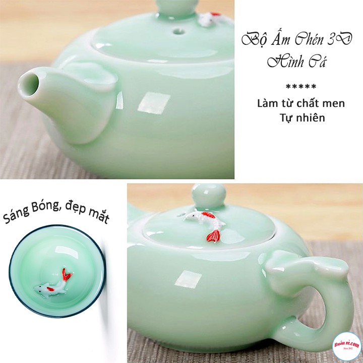 Bộ Ấm Chén 3D hình cá - màu xanh thiên thanh - Bộ Ấm Chén 3D hình cá với các chú cá chép nổi bên trong các chén trà, tạo hình trang nhã, đẹp mắt - Bộ Ấm Chén 3D hình cá giúp làm đẹp ngôi nhà thân yêu của bạn , vừa để cả gia đình cùng thưởng thức những tách trà thơm ngon, đậm đà tình cảm, vừa để tiếp khách quý đến. - Chất Liệu : Bộ Ấm Chén 3D hình cá được làm từ men thiên nhiên , và nung nóng ở nhiệt độ 1.320 độ c nên lớp men trở nên sáng bóng. đẹp mắt . - Bộ Ấm Chén 3D hình cá Là sự kết tinh của sự sáng tạo và tình yêu nghề của các nghệ nhân Bát Tràng để tạo ra sản phẩm độc đáo mà không nơi nào có. - Bộ Ấm Chén 3D hình cá vừa đem đến cho bạn những buổi thưởng trà đầy thi vị, vừa tô điểm cho không gian phòng khách thêm hiện đại, tiện nghi. - Bộ sản phẩm sang trọng thích hợp cho trang trí bàn trà đẹp và làm quà tặng, quà biếu tết. – Bộ Ấm Chén 3D hình cá bao gốm 6 chén cá và 1 ấm, 1 hộp đựng