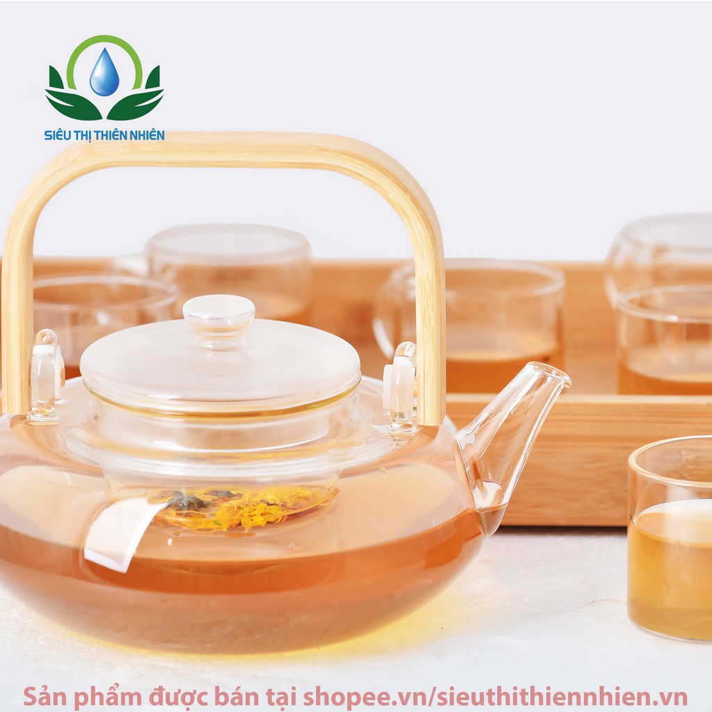 Thành phần: - 1 ấm trà thủy tinh Borosilicate chịu nhiệt cao cấp từ -20 – 135 độ C, dung tích 800ml Thiết kế quai gỗ chắc chắn, có lõi lọc thủy tinh. Kích thước 14.6 cm * 18,4 cm - 6 chén thủy tinh chịu nhiệt cao cấp - 1 khay tre cao cấp