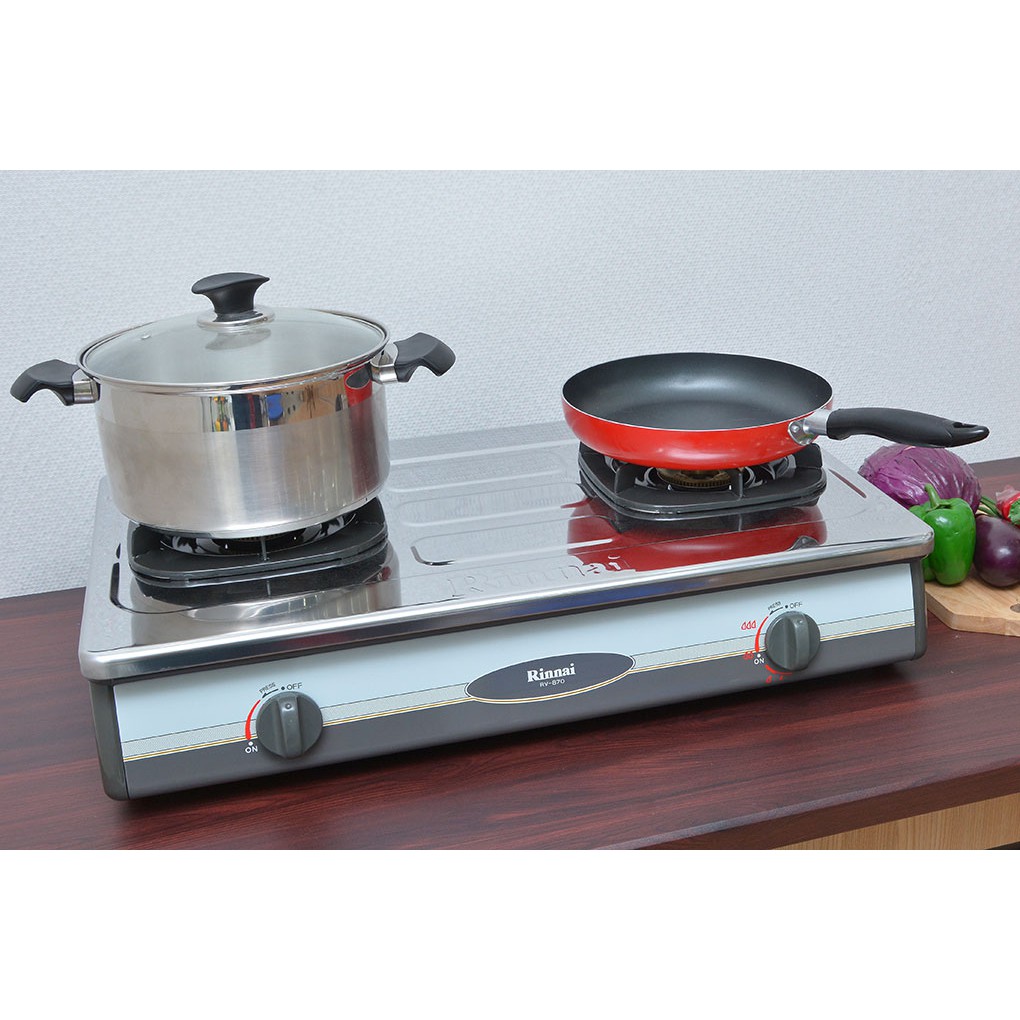 ƯU ĐIỂM NỔI BẬT: - Bếp gas Rinnai RV-870SSB(M) được thiết kế thông minh với 2 bếp nấu có kích cỡ lớn nhỏ khác nhau thích hợp cho nhiều loại xoong chảo có kích thước khác nhau. Nhờ đó, bếp gas tiết kiệm nhiệt lượng tối đa nhờ ngọn lửa vừa vặn với đáy nồi, giảm hao phí, lại còn tăng tốc độ nấu chín thức ăn. - Bếp có đầu hâm cho ngọn lửa tập trung ở trung tâm đầu đốt rất tiện lợi, giúp tiết kiệm tối đa khi người dùng cần hâm nóng, giữ nóng thức ăn, hoặc khi cần hầm, ninh thức ăn trong thời gian lâu. - Bếp còn được trang bị bộ kiềng đỡ bằng thép không gỉ tráng men cách nhiệt tăng độ cứng và bền chắc, vững chãi, để nồi niu không bị chênh khi nấu. Kiềng bếp có thể tháo rời, dễ dàng vệ sinh. - Bếp sử dụng hệ thống đánh lửa Magneto, đánh lửa Magneto cơ học bằng đá lửa cực bền và dễ sử dụng. Núm xoay điều chỉnh độ lửa của bếp.được đặt tại vị trí thuận lợi, giúp người dùng dễ dàng mở bếp, tắt bếp thật an toàn, kiểm soát ngọn lửa và nhiệt độ khi nấu. - Bếp gas đôi Rinnai RV-870SSB(M) có mặt bếp làm từ Inox, luôn sáng.đẹp và không bám bẩn, giảm bớt gánh nặng khi vệ sinh bếp gas. Mặt bếp bền chắc, chịu nhiệt tốt, chịu được áp lực và trọng lực lớn, thiết kế đơn giản, sang trọng phù hợp với nhiều không gian bếp khác nhau. - Bếp sử dụng loại đầu đốt có các rãnh nhỏ xung quanh đầu đốt, cho ngọn lửa to và tỏa đều, giúp thức ăn chín mềm dưới nhiệt độ ổn định một cách nhanh chóng. Đầu đốt của bếp làm từ kim loại đồng thau rất dày và có độ bền cao, không bị biến dạng, không bào mòn khi tiếp xúc với nhiệt độ cao thường xuyên và cho ra ngọn lửa xanh đẹp mắt, không làm ố vàng đáy nồi, chảo khi nấu.